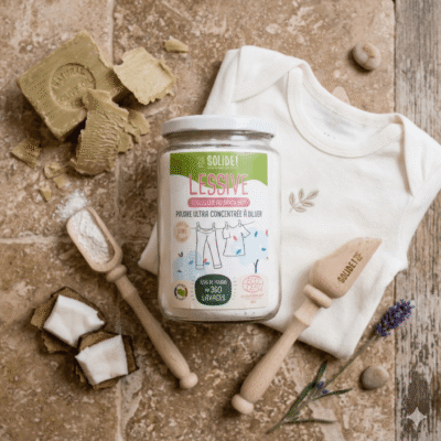 Laver le linge de bébé avec Solide !, c’est aussi préserver le monde dans lequel il va grandir. Nos emballages sont 100% sans plastique et nos formules sont biodégradables, à base d’ingrédients naturels essentiellement dont une partie de bio. En choisissant une solution de lessive zéro déchet, vous évitez le rejet de microplastiques et de résidus toxiques dans les nappes phréatiques.
